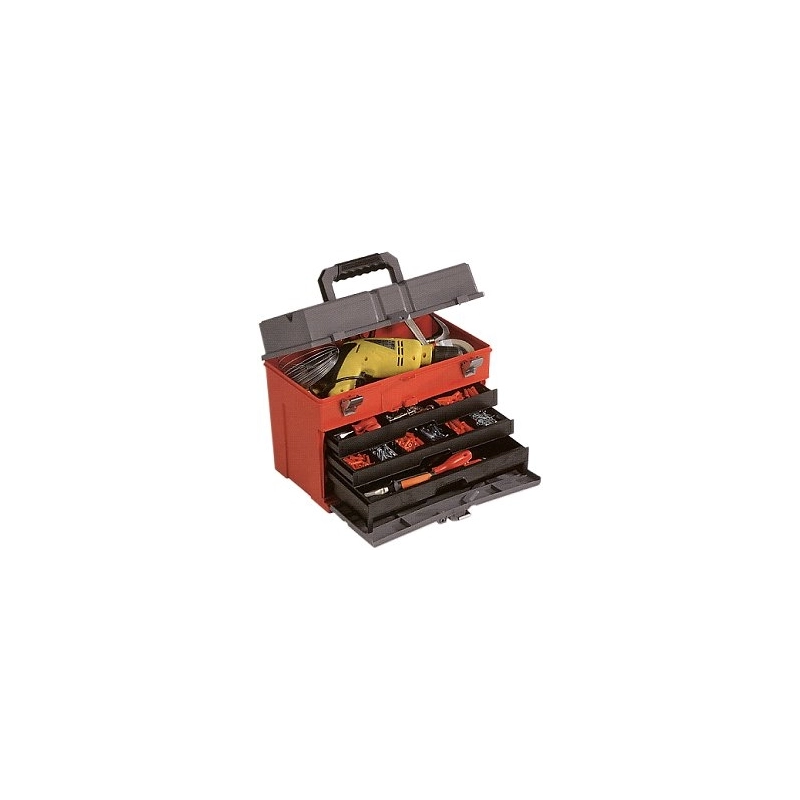 In polipropilene, con vano superiore portautensili chiusure in acciaio e 3 cassetti con sportello di sicurezza e scomparti da 16 a 32. Possibilita' di lucchetto. Dimensioni cm 44x25x33h