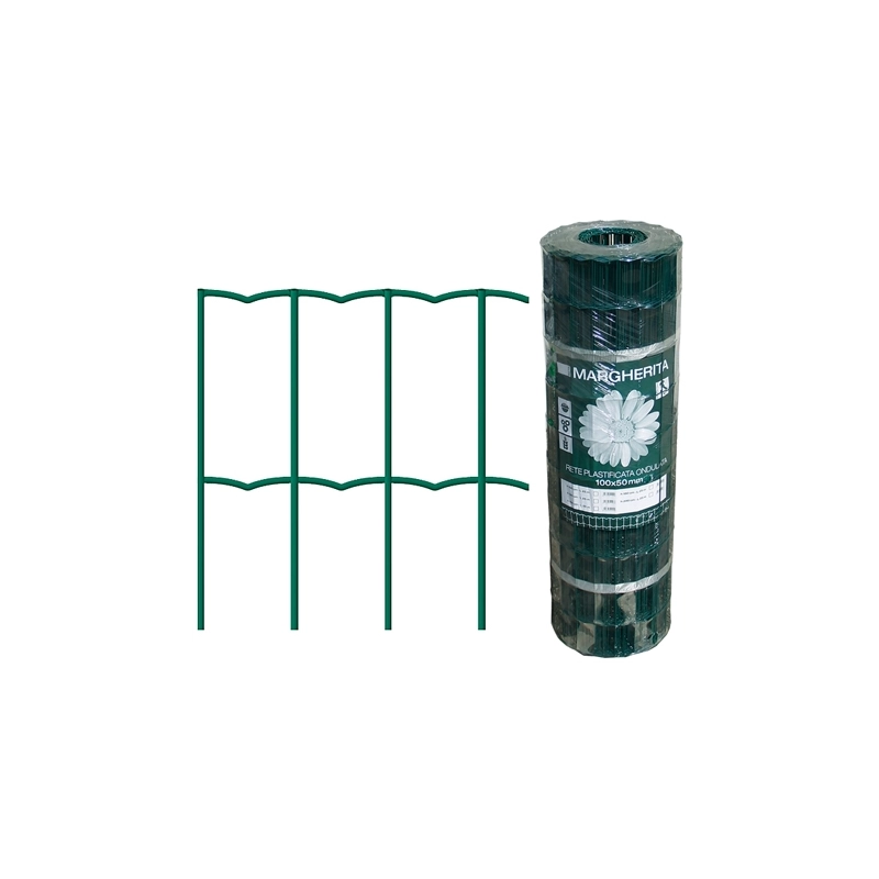Rete elettrosaldata in filo zincato e plasticato. Fili orizzontali ondulati. Filo diametro mm 2,10. Maglie mm 100x50. Colore verde. Rotoli m 25. Modello = altezza in cm