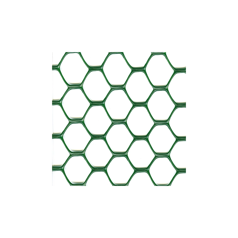 Rete a maglia esagonale in plastica, provvista di cimosa ai bordi. Impiego: delimitazioni decorative, protezioni per balconi. Colore verde. Maglia da 30x30 mm. Rotoli da m 50. Modello = altezza in cm