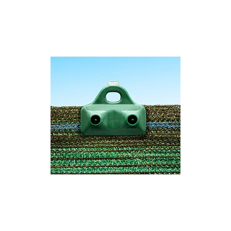 Morsetti in polipropilene per il fissaggio di tessuti e reti ombreggiante alle strutture portanti. Dimensioni 53x40 mm. Colore verde.