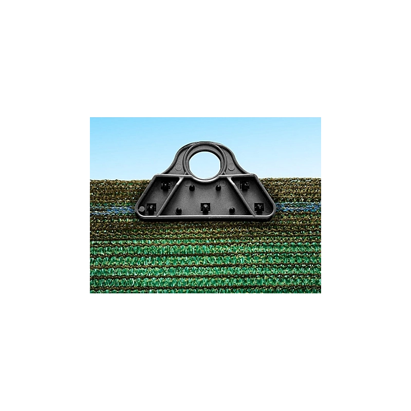 Piastrina a 9 punte, molto resistente alla trazione. Per il fissaggio di tessuti e reti ombreggiante. Ideale per zone ventose. Dimensioni 78x45 mm.