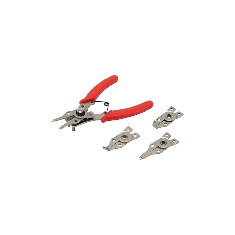 Pinza universale in acciaio finitura nichel con molla, per anelli elastici sia interni che esterni. 4 teste intercambiabili. Per anelli elastici da diametro10 a 50 mm. Manici ricoperti in plastica. Lunghezza 160 mm.