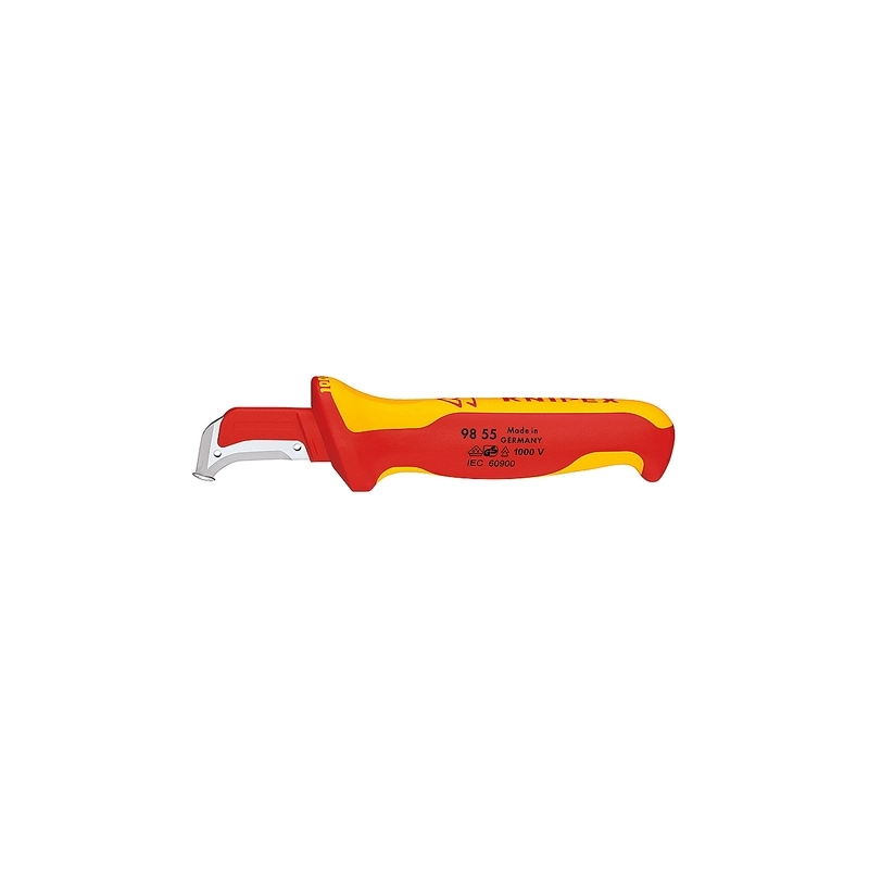Coltello con impugnatura isolante in materiale bicomponente collaudato VDE. Lama fissa in acciaio inox temperato a forma di falce. Con pattino guida all'estremita' della lama che evita di danneggiare il cavo interno. Lunghezza 180 mm.