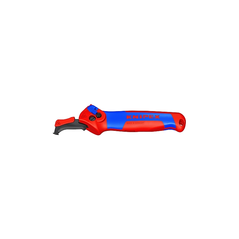 Coltello spelacavi con guida scorrevole e funzione a cricchetto per il taglio di guaine di cavi a grande sezione. Lama versatile con 3 zone di taglio per il taglio circonferenziale e longitudinale. La guida scorrevole protegge l'isolamento del conduttore sotto la guaina. Lama uncinata intercambiabile pieghevole a forma di falce. Lama con 4 posizioni di arresto: piegata, dritta, angolata e mobile