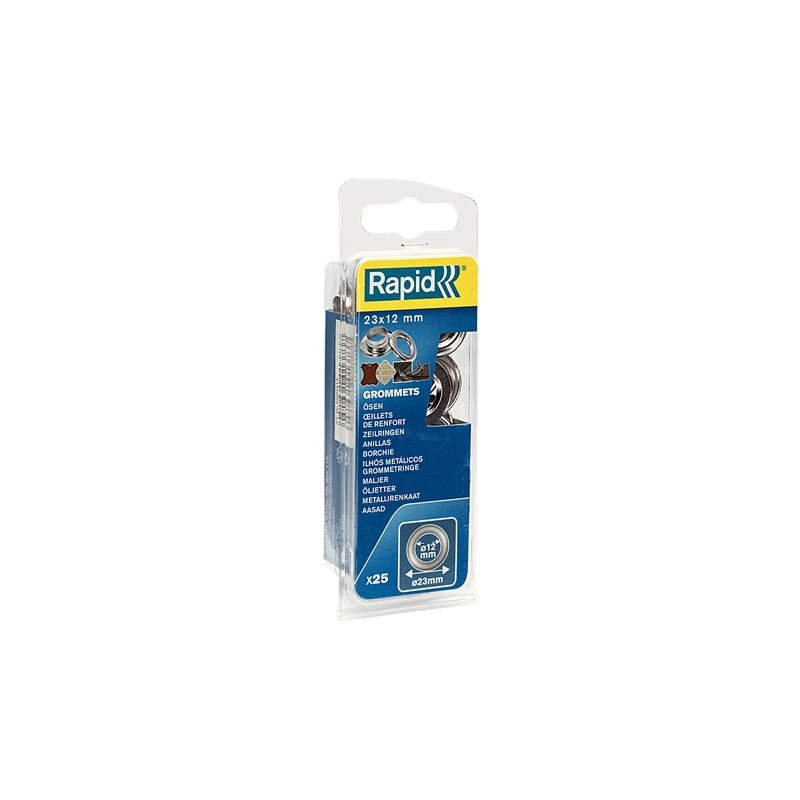 Anelli in acciaio finitura cromata. Diametro esterno 23 mm, diametro interno 12 mm. Applicazioni: fori per striscioni, giacche, cinture, teli in plastica e tessuto sintetico, cartoni laminati, ecc.. Ribattitore incluso. In blister da 25 pz.