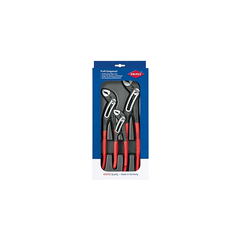 Set 3 pinze Alligator misure mm 180/250/300. Pinza regolabile in acciaio al cromo vanadio, forgiato, temperato ad olio. Manici rivestiti in resina sintetica antiscivolo. Regolazione a scatto su 9 posizioni. Denti trattati con speciale tempera, durezza 61 HRC.