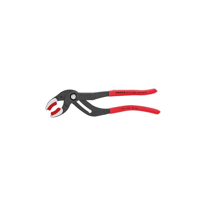 Pinza regolabile in acciaio al cromo vanadio con manico rivestito antiscivolo. Capacita' di lavoro diametro 10-75 mm. Ganasce con inserto antigraffio in nylon removibile con viti. 25 possibilita' di regolazione. Lunghezza 250 mm. Peso 355 g.