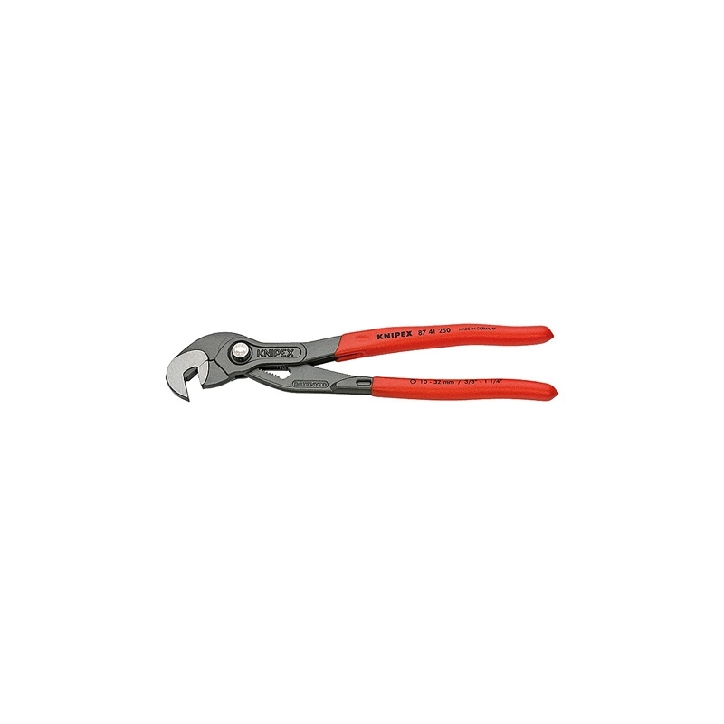 Chiave pinza in acciaio al cromo vanadio, forgiato, temperato ad olio. Manici rivestiti in resina sintetica antiscivolo. Sostituisce un assortimento completo di chiavi da 10 a 32 mm. Regolazione mediante pulsante direttamente sul pezzo in lavorazione, anche con una sola mano. Eccezionale presa anche su bulloni tondi o spannati. Lunghezza mm 250