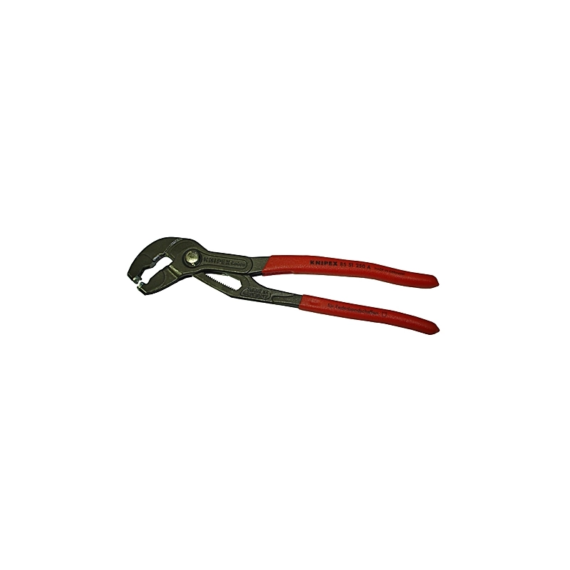 Pinza per fascette elastiche, in acciaio al cromo vanadio, forgiato, temperato ad olio, manici rivestiti in resina sintetica antiscivolo. Ganasce con inserti universali girevoli per una presa sicura delle fascette in ogni posizione. Apertura massima fino a 80 mm; corsa di serraggio di oltre 40 mm. Lunghezza 250 mm.