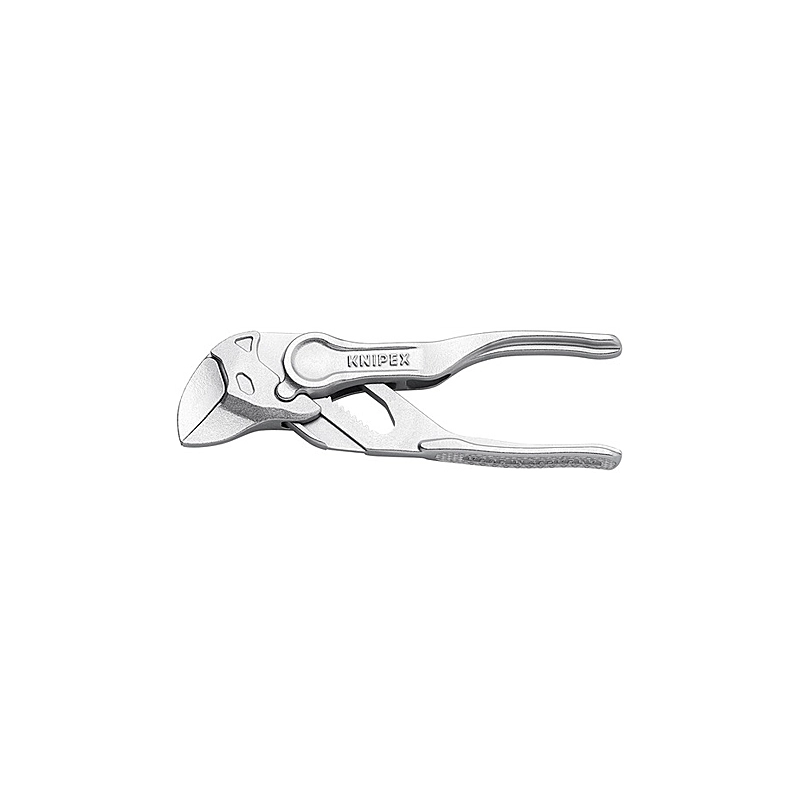Combinazione di pinza e chiave in un unico utensile. In acciaio al cromo vanadio, forgiato, temperato ad olio. Regolazione di apertura a pulsante. Apertura massima mm 21. Lunghezza 102 mm. Peso 70 gr.
