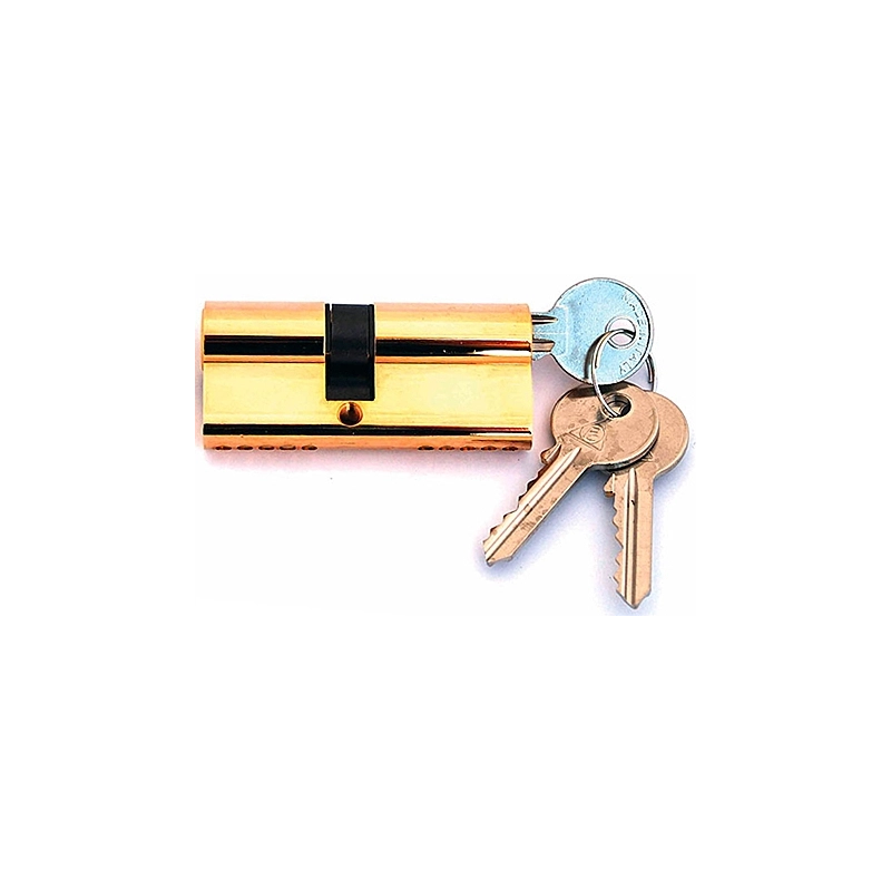 Doppio cilindro profilato. Finitura: ottone trafilato. 3 chiavi in dotazione duplicabili con chiavi universali. Made in Italy. Modello = lunghezza totale mm/posizione centro nottolino mm
