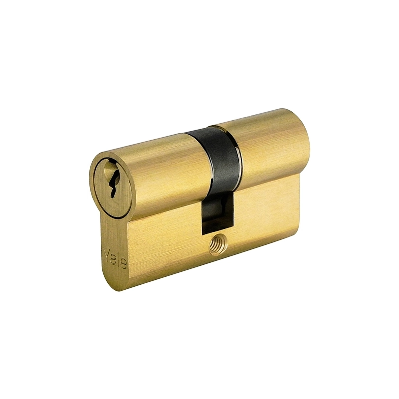 Doppio cilindro profilato completo di vite ottonata M5X75 mm. Nottolino DIN mm 10. Finitura: ottone lucido. Chiave duplicabile con grezzo originale Yale. Modello = lunghezza mm/posizione centro nottolino mm/numero perni