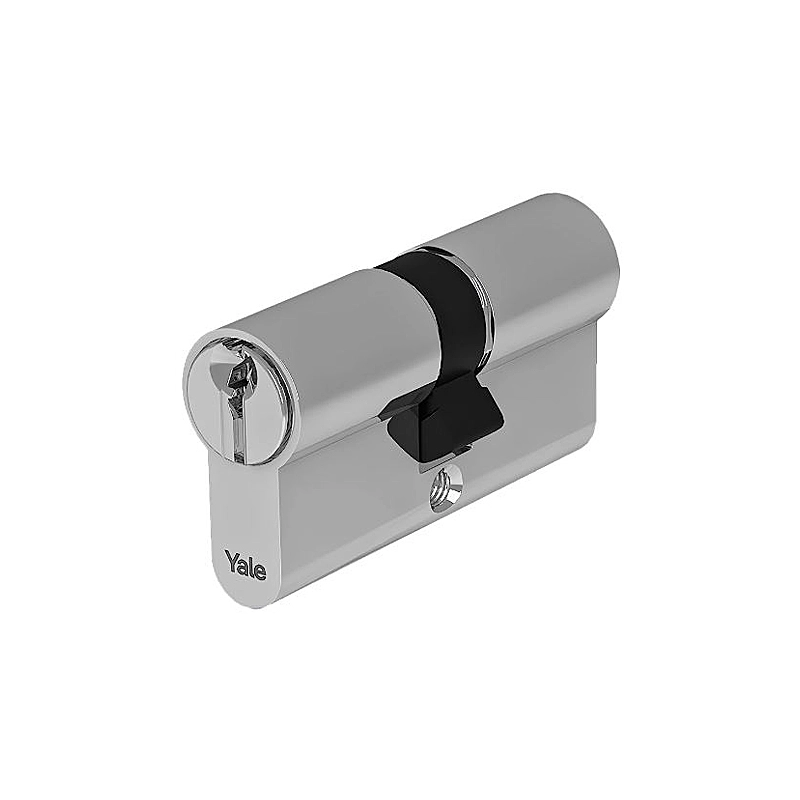 Doppio cilindro frizionato. Livello di protezione standard 5 pin. Chiave verticale. 3 chiavi in dotazione. Chiave duplicabile con grezzo originale Yale. Finitura nichelata. Modello = lunghezza mm/posizione centro nottolino mm