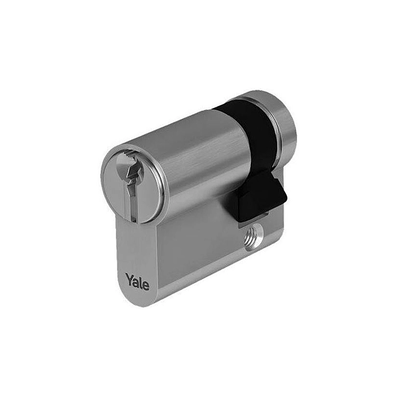 Mezzo cilindro. Livello di protezione standard 5 pin. 3 chiavi in dotazione. Chiave duplicabile con grezzo originale Yale. Finitura nichelata. Modello = lunghezza mm/posizione centro nottolino mm