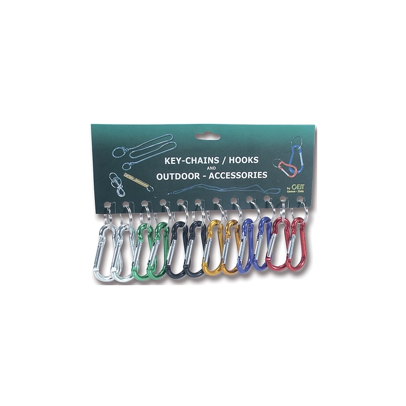 In alluminio. Con apertura a molla + anello portachiavi. Colori assortiti. In cartella da 12 pz. Modello = misura mm