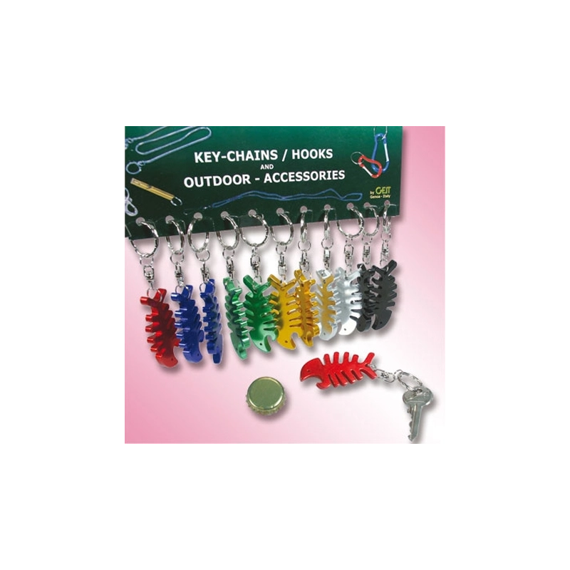 In alluminio. Soggetto LISCA DI PESCE. Utilizzabili anche come "apribottiglie". Colori assortiti. In cartella da 12 pz.