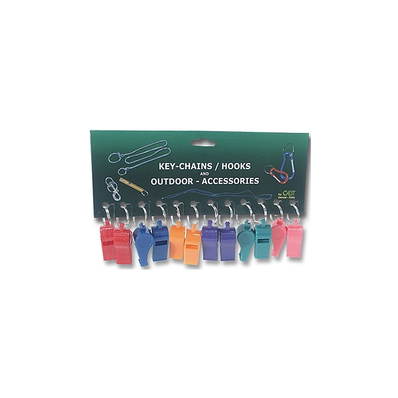 Fischietti in plastica con anello portachiavi. Colori assortiti. In cartella da 12 pz.