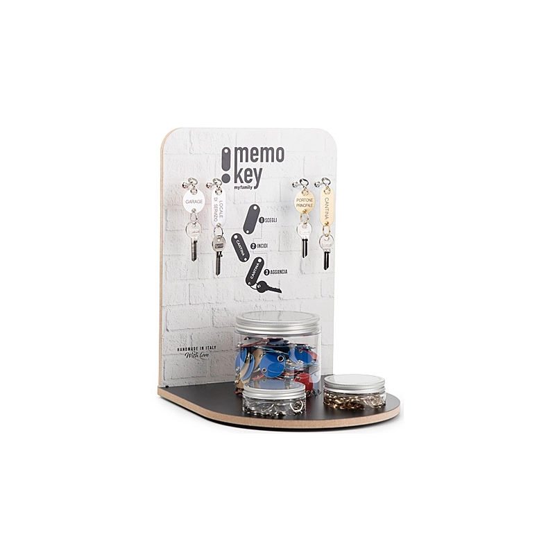 Display composto da 160 targhette portachiavi assortite di forma tonda (argento-rosso oppure oro-blu) e di forma ovale (argento-rosso oppure oro-blu) e di 200 anellini colori oro o argento. Disponibili i codici singoli per il riordino. Modello = tipo