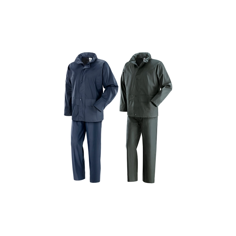 Completo in poliuretano e PVC formato da giacca e pantaloni. Caratteristiche giacca: peso 300 gr/mq, supporto interno in poliestere, cappuccio fisso a scomparsa con elastico, aerazione sul dorso e sotto le ascelle, chiusura con cerniera, 2 tasche con patta antipioggia. Caratteristiche pantaloni: peso 300 gr/mq, elastico in vita, 2 tasche laterali passamano. Modello = taglia/colore