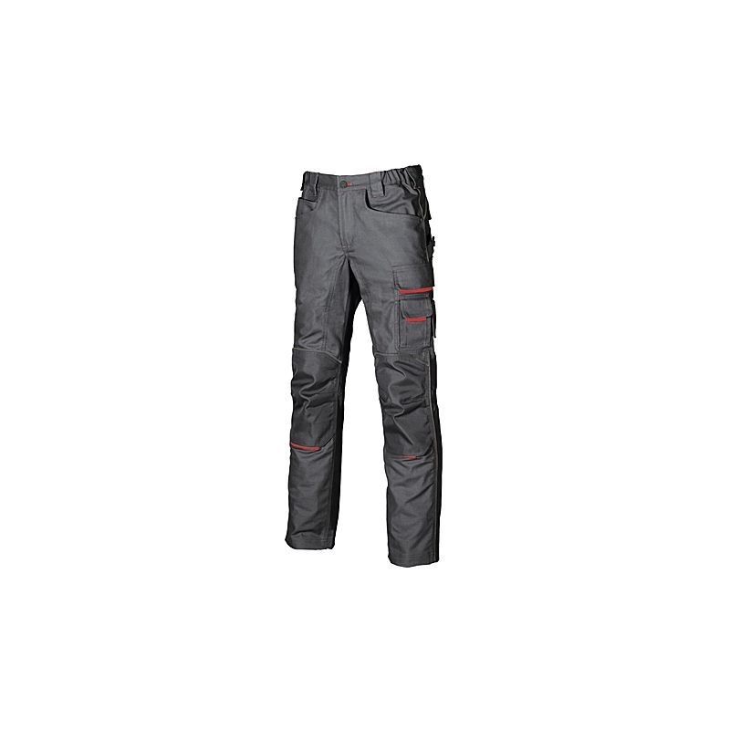 Pantalone multitasche in cotone 60% e poliestere 40%, 300 g/m2, cavallo rinforzato. Triple cuciture. Vita regolabile. Ampie tasche anteriori, laterali e porta metro regolabile. Tasche porta ginocchiere. Inserti in reflex. Colore grigio meteorite. Modello = taglia