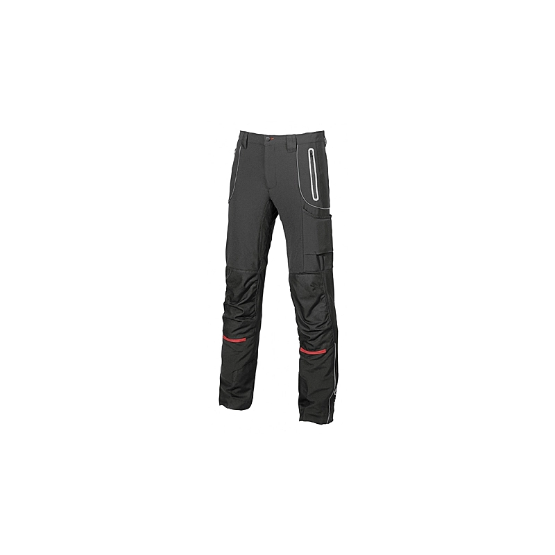 Pantalone in tessuto Soft Shell, stretch e massimo confort, antivento e idrorepellente. 96% poliestere e 4% elastene, 290g/m2. Tasche anteriori con zip, tasca laterale porta attrezzi. Inserti in reflex. Colore nero. Modello = taglia