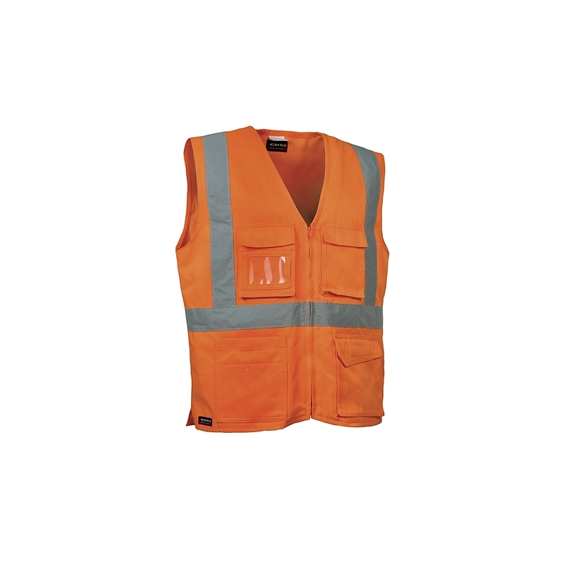 Gilet ad alta visibilita' con 4 tasche anteriori e chiusura centrale con zip. Composizione 65% poliestere e 35% cotone. Peso 245 g/mq. Normativa EN ISO 13688:2013. Colore arancio. Modello = taglia