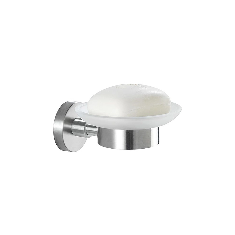 Portasapone in acciaio inox satinato. Piattino estraibile in vetro satinato. Viti e tasselli inclusi. Dimensioni 11x13x5,5 cm. Sistema di fissaggio POWER LOC per il fissaggio senza viti da acquistare a parte.