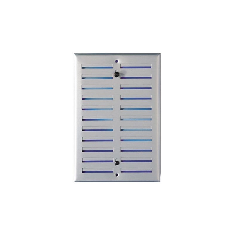 Griglia d'aereazione regolabile utilizzabile anche per la diffusione di aria calda recuperata da stufe e camini a legna o pellets. In alluminio anodizzato argento. Dimensioni 168x190 mm.