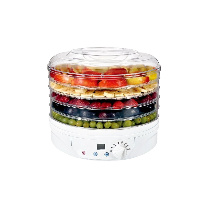 Disidratatore per frutta e verdura 230 - 260W. Regolatore digitale del tempo di funzionamento. Regolazione temperatura max 70 gradi, altezza vassoi 3,3 cm. Completo di 5 vassoi e coperchio.