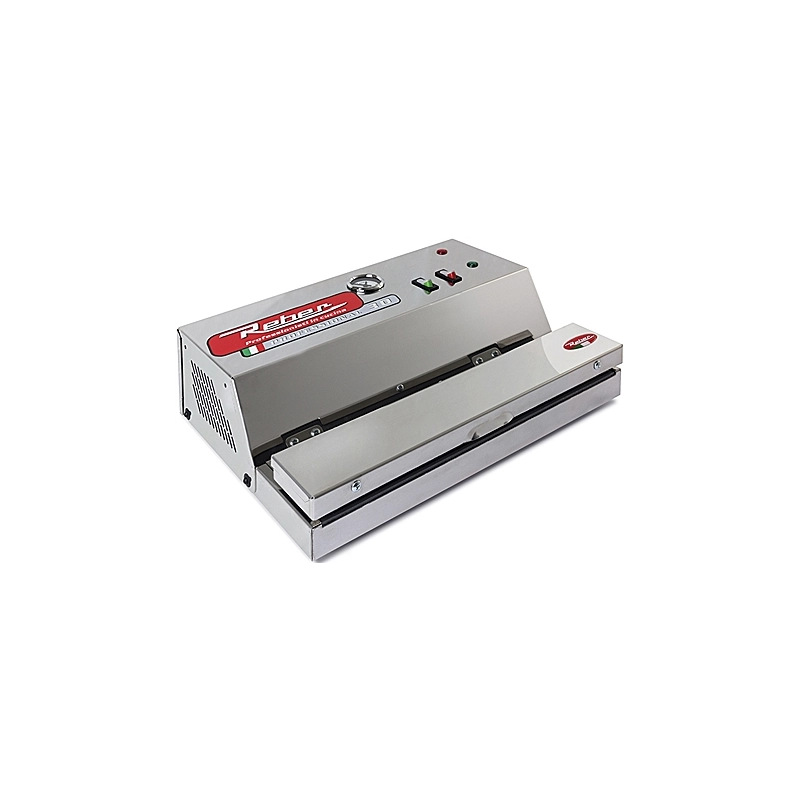 Macchina per sottovuoto con corpo in acciaio inox. Vuotometro professionale. Pompa a pistone autolubrificante a doppio corpo. Capacita' di aspirazione 18 lt/min. 320 Watt. Barra saldante da 32 cm. Funzione supervuoto. Funzionamento a ciclo continuo, automatico o manuale. Potenza di saldatura regolabile. Dimensioni 37x27x11 cm.