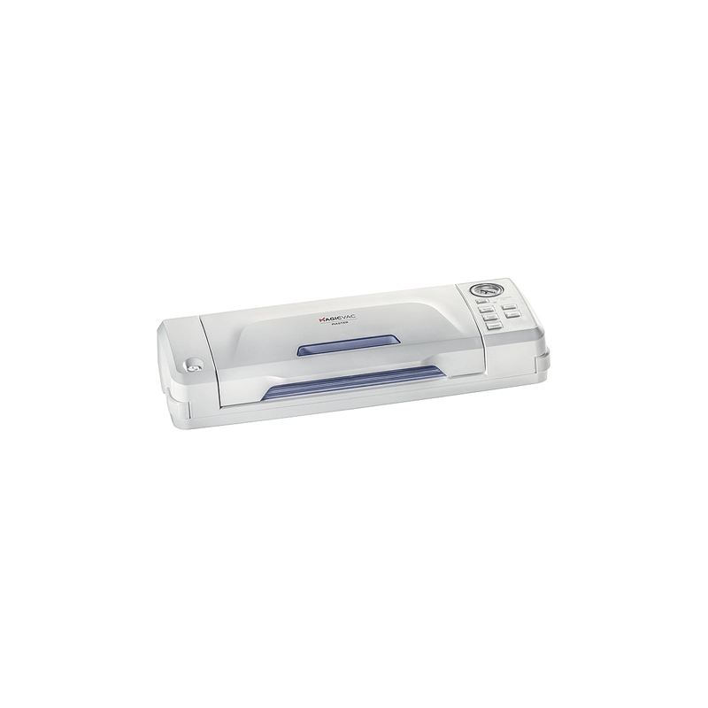 Macchina per sottovuoto con portarotolo e taglia-sacchetti bidirezionale integrata. Vuotometro analogico. Aspirazione e saldatura automatica del sacchetto con possibilita' manuale per cibi fragili. Tastiera impermeabile multifunzione. Barra saldante professionale in alluminio. Vaschetta raccogli liquidi estraibile. Vano raccogli-cavo integrato. Dimensioni 51x17,5x10,5h cm. Peso kg 3.