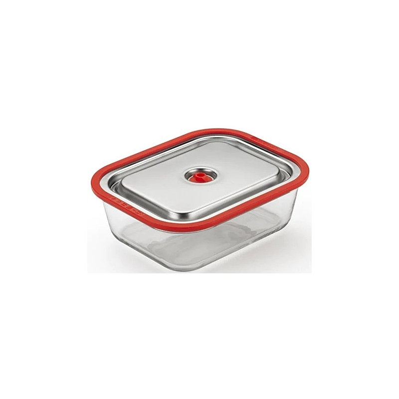 Teglia in vetro ad alto spessore resistente agli sbalzi termici con coperchio in acciaio inox con guarnizione di tenuta. Permette di cucinare in modo tradizionale, cucinare sottovuoto, marinare i prodotti, conservare sottovuoto. Capacita' 1950 ml. Dimensioni cm 23,5x18,4x8,4h.