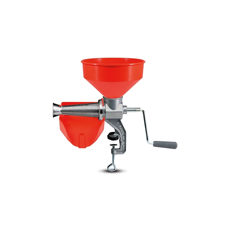 Spremipomodoro con corpo in ghisa trattata per uso alimentare con vernici epossidiche applicate a caldo. Cono filtro in acciaio inox. Elica passapomodoro in resina acetalica, conforme al contatto con gli alimenti e ad alta resistenza. Manovella in acciaio con manopola in plastica. Morsetto di fissaggio a tavolo con protezione in gomma. Dimensioni 45x28,5x37h cm. Peso 2,2 kg.
