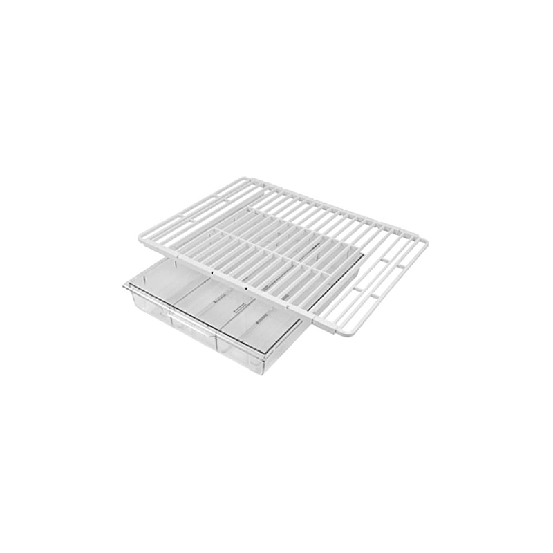 Ripiano universale per frigorifero completo di cassetto porta alimenti. Il kit e' composto da un piano grigliato e un cassetto porta alimenti con i suoi due separatori interni. Ripiano estensibile di dimensioni 35x38 cm. Il kit si adatta a quasi tutti i frigoriferi.