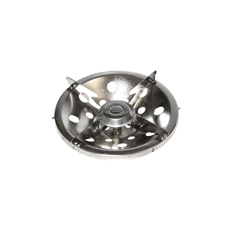 Senza rubinetto. Attacco femmina per bombole tipo Eurocamping. Materiale: acciaio cromato. In scatola singola litografata.