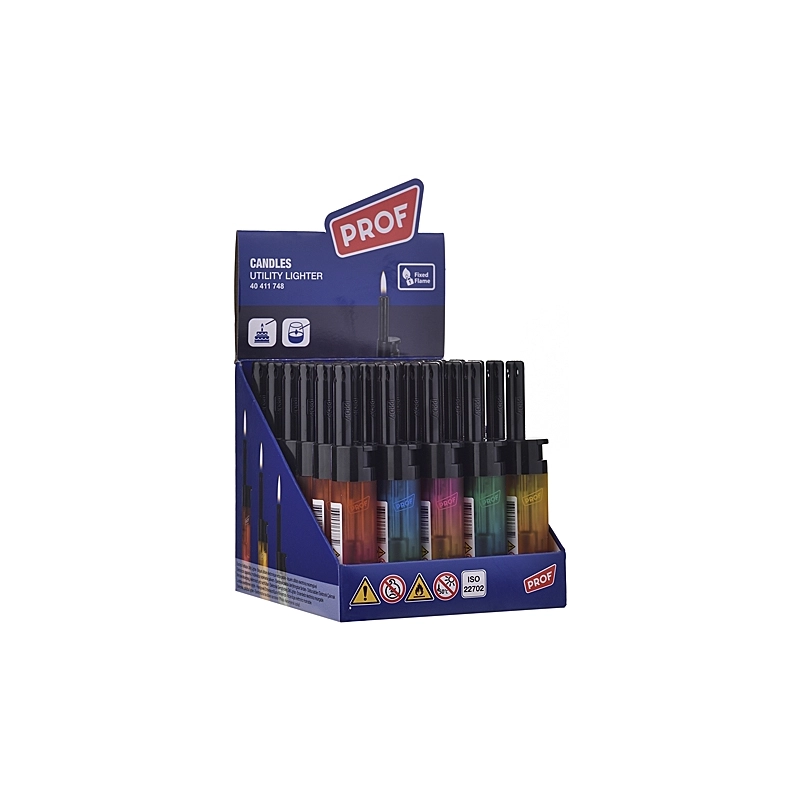 Espositore da banco da 30 pezzi di accendigas corti, ricaricabili. Colori assortiti. Lunghezza totale 11 cm.