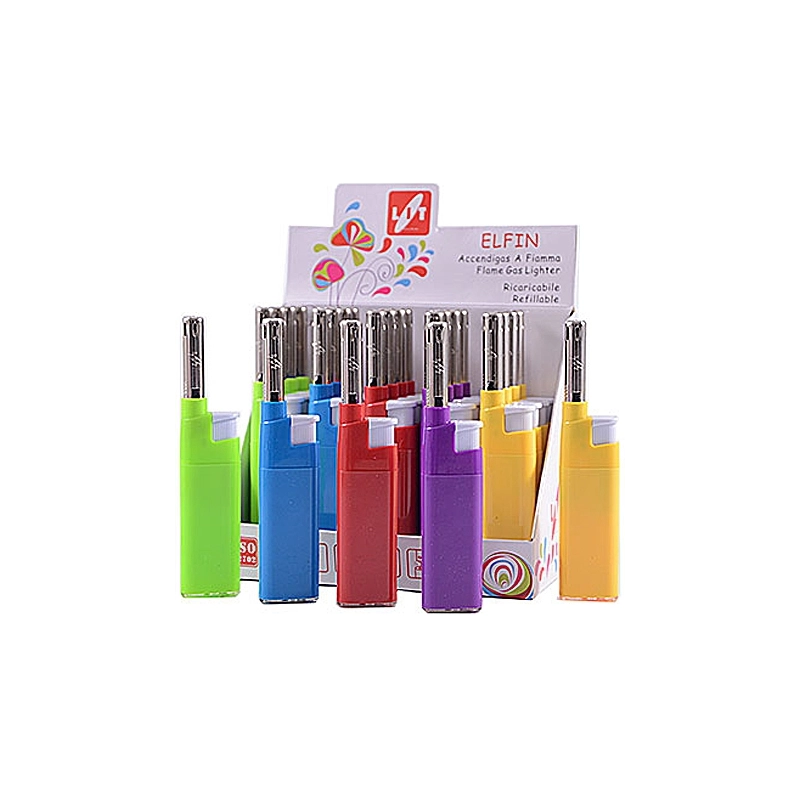 Espositore da banco da 25 pezzi di accendigas corti, ricaricabili. Lunghezza totale cm 12. Colori assortiti.