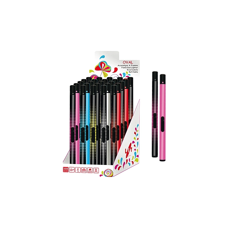 Espositore da banco da 25 pezzi di accendigas lunghi. Ricaricabili. Lunghezza totale mm 230. Colori assortiti.