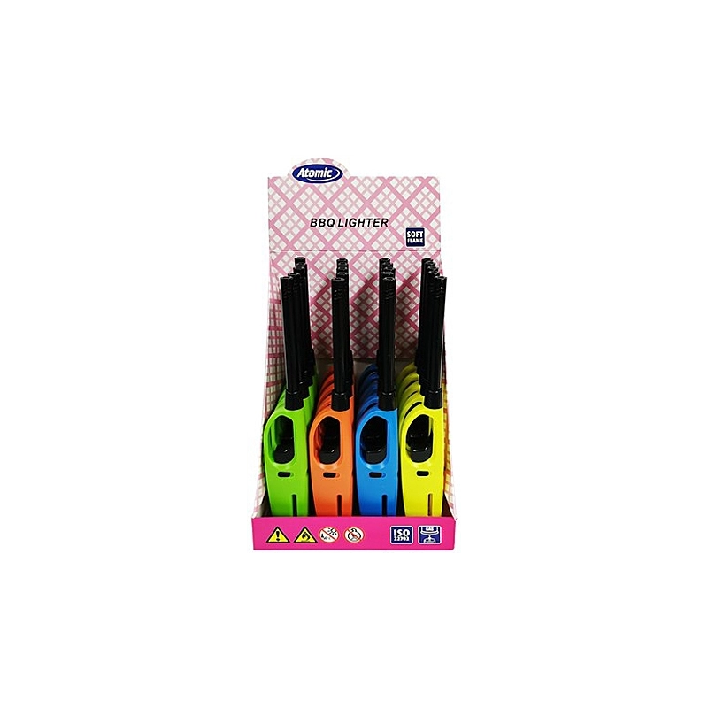 Espositore da banco 20 pz. accendigas, ricaricabili. Con anello per appenderli. Altezza cm 23. Colori assortiti.