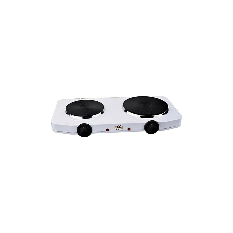 Fornello a 2 piastre con piedini antiscivolo. Con termostato per la regolazione della temperatura. Piastre in ghisa di diametro mm 155 e 185. Corpo in acciaio. Potenza watt 1000/1500.