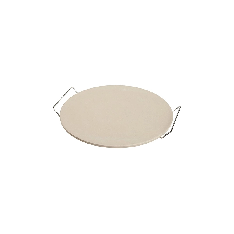 Piastra in pietra refrattaria ideale per cuocere pizza e pane. Emana calore in modo uniforme. Adatto per griglia e forno. Con poggia-pietra in metallo. Diametro 33 cm.