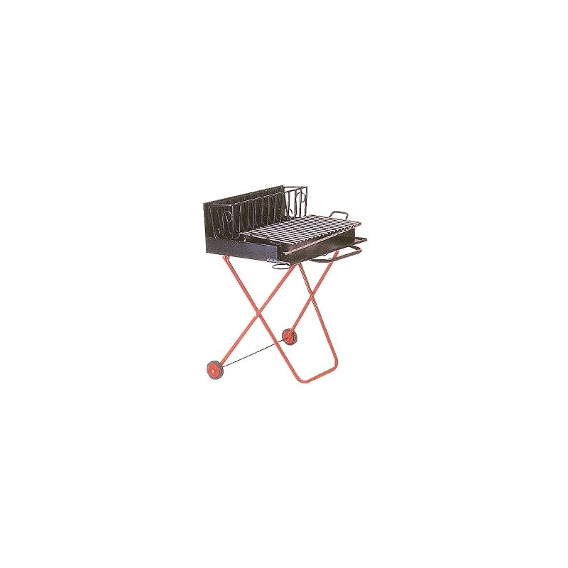 Braciere in acciaio verniciato nero. Gambe ripiegabili verniciate rosso con ruote. Griglia in acciaio inox. Modello = larghezza braciere cm.