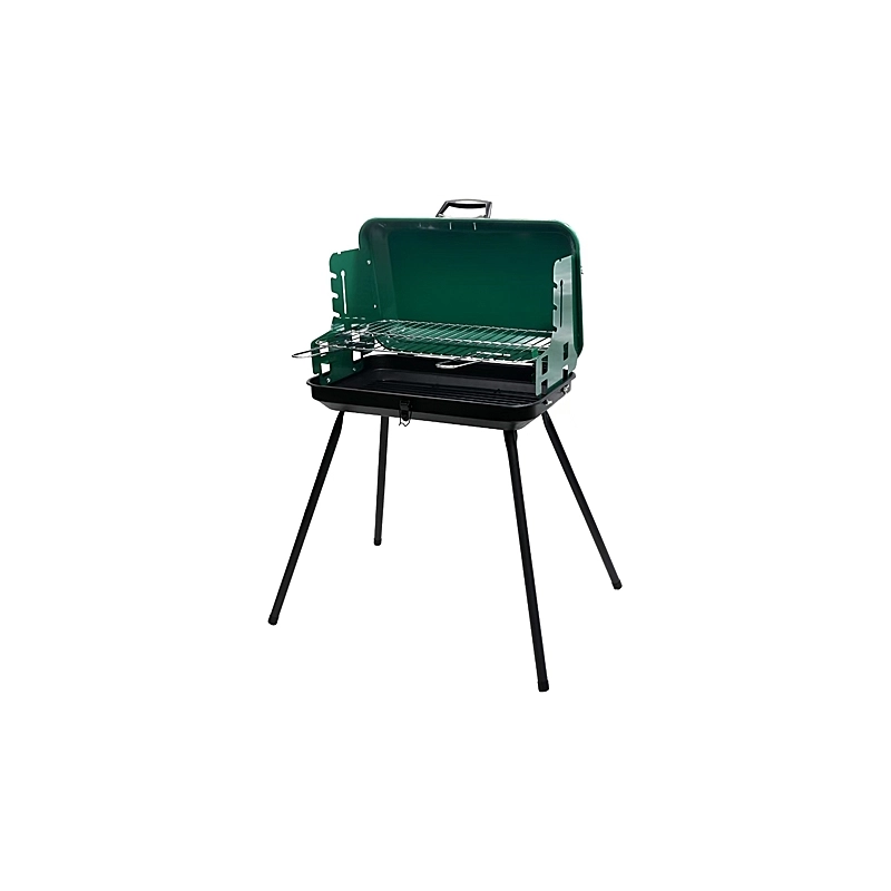 Barbecue a valigetta in acciaio verniciato completo di coperchio. Griglia di cottura in acciaio cromato regolabile in 2 posizioni, certificata per alimenti, con manici richiudibili. Paraventi laterali in acciaio verniciato. Reggibrace smaltato. Dimensioni griglia 46,5x28 cm. Peso 4,4 kg.