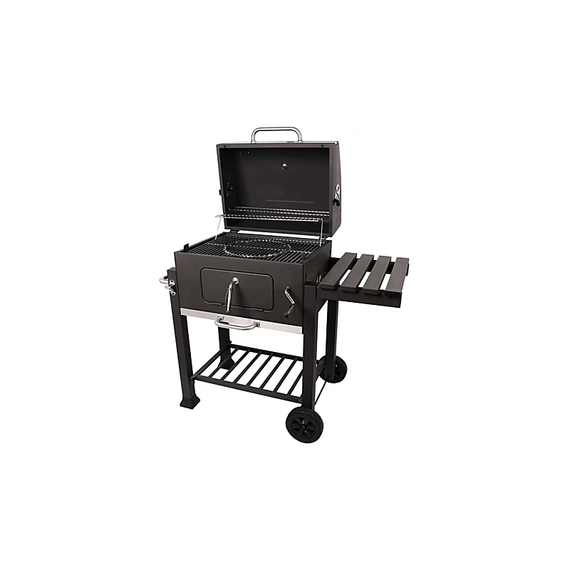 Barbecue a carbonella con coperchio. Ampia porta anteriore per caricare la carbonella. Con termometro e griglia scaldavivande. Facile accensione grazie ai 4 aeratori posti 2 sulla vasca e 2 sul coperchio. Altezza griglia regolabile con comoda manovella posta sulla plancia anteriore. Dimensioni 116x66x109 cm.