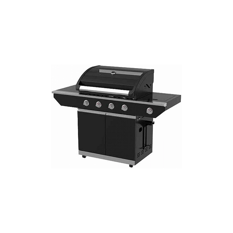 Struttura in acciaio verniciato di colore nero. Piano di cottura principale mm 720x480 composto da 1 piastra smaltata in ghisa e 1 griglia smaltata in ghisa. 3 bruciatori in acciaio con potenza massima 10,2 Kw. Coperchio con ampia maniglia di apertura e termometro. 1 ripiano laterale. Piano cottura laterale con sistema ad infrarosso da 3,1 Kw. Con ruote. Dimensioni 155,5x53,5x118h cm.