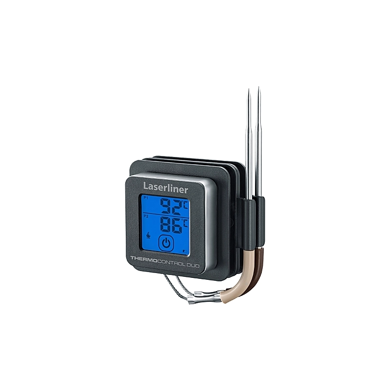 Termometro che consente di controllare 2 pietanze contemporaneamente e rilevare la temperatura interna della carne direttamente dall' applicazione gratuita ThermoControl app. Con magnete per fissaggio al forno o al barbecue. Funzione di allarme ottico e acustico per non bruciare le pietanze.