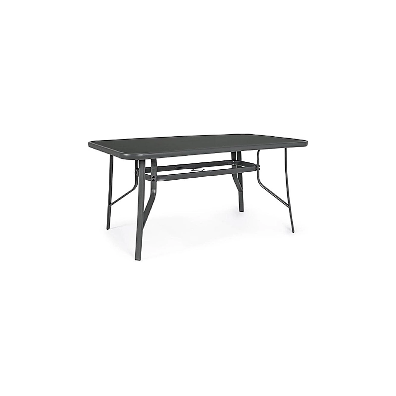 Tavolo in acciaio, verniciato a polvere epossidica. Piano in vetro temperato. Gambe da assemblare. Colore grigio. Dimensioni 150x90x70h cm.