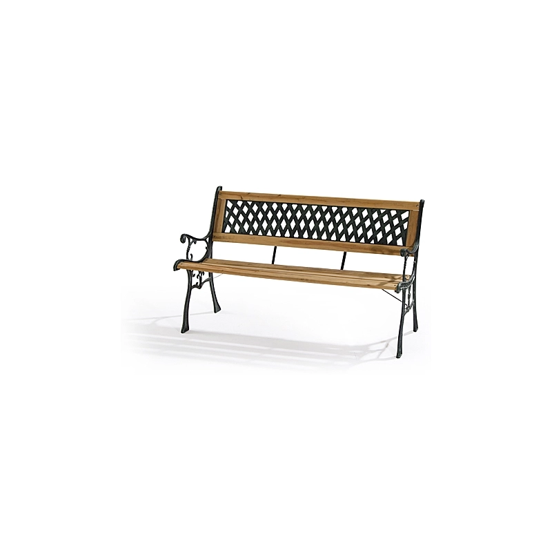Panchina da esterno in ghisa e legno con schienale in plastica effetto ghisa. Dimensione 125x52x74h cm.