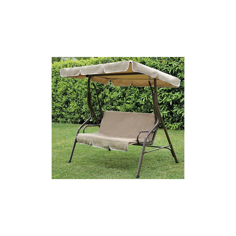 Dondolo 3 posti con struttura in tubo d'acciaio verniciato marrone, seduta in tessuto poliestere 600D marrone. Dimensioni 170x115x152 cm.