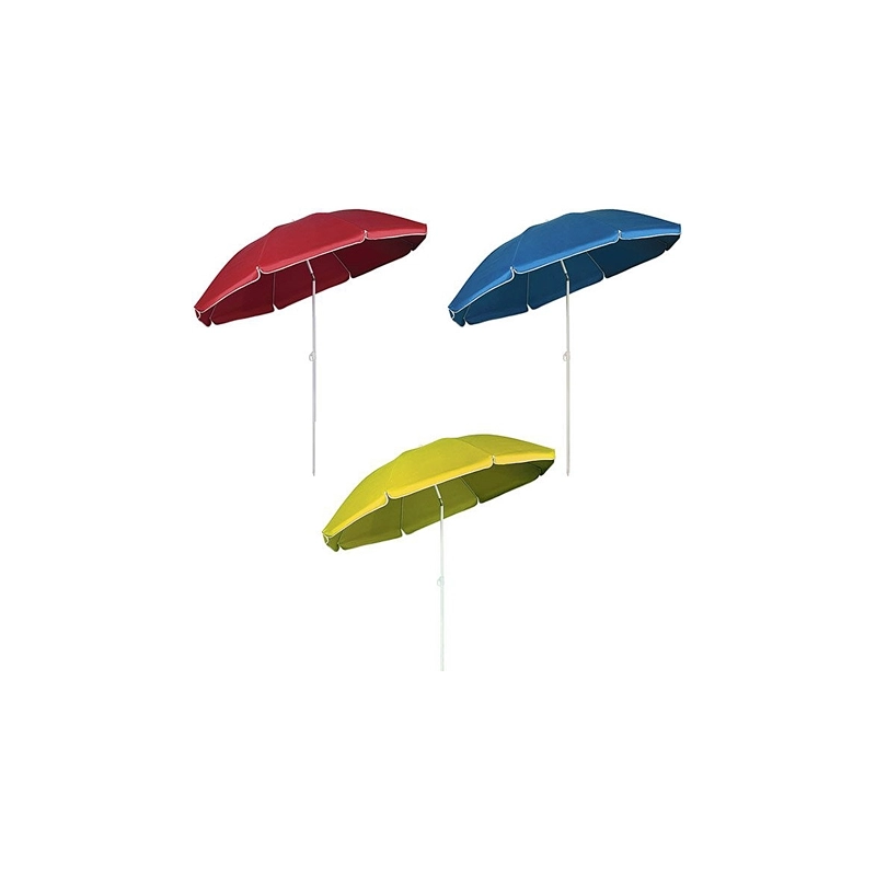 Ombrellone con palo in metallo diametro mm 19/22. Copertura in nylon con apertura 180 cm. Reclinabile con snodo. Fornito con borsa tracolla in nylon. Colori assortiti (rosso, giallo e blu).